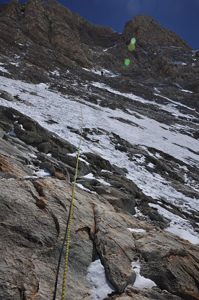| Vo výške asi 6550 metrov prichádzam ku traverzu, ktorý vedie pod takmer kolmý skalný úsek. Vyberám si spodnejšie lano a po chvíľke zbadám po pravej strane niečo čudné, omotané a zavesené okolo skaly. Ako prichádzam bližšie, zisťujem podľa trčiacich expedičných topánok a časti nôh, že ide o mŕtveho horolezca zabaleného v stane. Zaháňam pochmúrne myšlienky a rýchlo opúšťam toto miesto s nie zrovna príjemným pohľadom. V BC sa neskôr dozvedám, že ide o mŕtveho poliaka, ktorý je tam už dva roky. | |